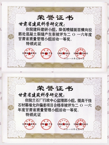 甘肅省建筑科學(xué)研究院在甘肅省第三十六次質(zhì)量管理小組年會暨成果發(fā)表會上再傳喜訊,科研院共申報八個小組成果,其中五項獲得省質(zhì)量管理小組一等獎,分別為《提高重型動力觸探試驗準確率》、《提高綠色建筑評價條文達標率》、《提高干掛石材幕墻允許偏差項目合格率》、《降低噴錨面層橫向拉筋處混凝土裂縫產(chǎn)生率》、《提高錨桿靜壓樁施工質(zhì)量》;另外三項獲得省質(zhì)量管理小組二等獎,分別是《提高鋁合金窗框安裝一次合格率》、《教學(xué)樓墻體加固內(nèi)墻抹灰面質(zhì)量控制》和《降低工程設(shè)計建筑專業(yè)與相關(guān)專業(yè)銜接環(huán)節(jié)差錯率》。
