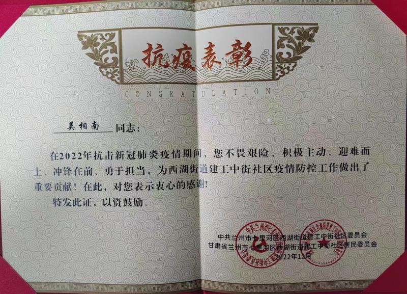 日前,蘭州市七里河區(qū)西湖街道建工中街社區(qū)委員會和居民委員會授予甘肅建科院市政公路專業(yè)事業(yè)部吳相南抗疫榮譽證書。