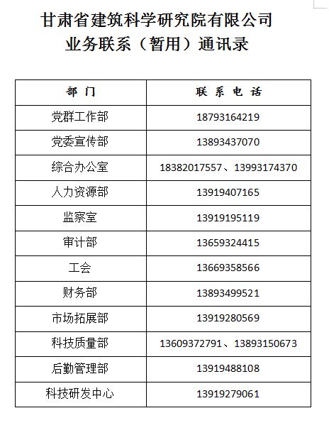 因搬遷,近期公共電話還不能使用,為不耽誤業(yè)務(wù)工作,方便工作的開(kāi)展,將暫時(shí)使用以下通訊錄。
