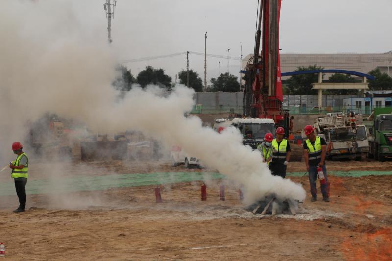 隨后,進行了火災演練:存放材料倉庫突然濃煙滾滾,火苗四竄,現(xiàn)場情況十分危急。工人從現(xiàn)場逃生,現(xiàn)場安全員第一時間向消防報警,并向項目負責人和建設(shè)單位領(lǐng)導報告,應(yīng)急指揮部立即啟動應(yīng)急預案,做出滅火救援部署。技術(shù)和救援小組第一時間到達現(xiàn)場進行救援,使用干粉滅火器及消防用水滅火,安全警戒組立即對著火點設(shè)置警戒線,防止其他工人進入危險地帶。