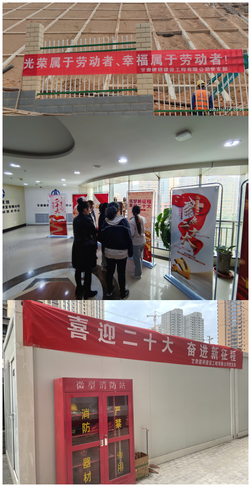 黨的二十大召開之際,甘肅建科院的辦公樓、項(xiàng)目現(xiàn)場裝扮一新,“喜迎二十大,奮進(jìn)新征程”等主題的景觀,營造出祥和喜慶的氛圍。鮮花、黨旗、黨徽和催人奮進(jìn)的標(biāo)語,凸顯全司職工凝心聚力謀發(fā)展,奮發(fā)有為迎盛會的喜悅。