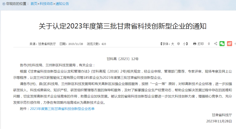 此次榮獲“2023年度甘肅省科技創(chuàng)新型企業(yè)”稱號,是對公司創(chuàng)新能力建設(shè)的肯定,同時也讓全體員工時刻牢記只有通過提高公司的創(chuàng)新研發(fā)能力,才能在市場競爭中取得先機(jī),促進(jìn)公司高質(zhì)量的發(fā)展。