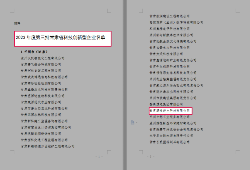 近日,從甘肅省科技廳下發(fā)的《關(guān)于認(rèn)定2023年度第三批甘肅省科技創(chuàng)新型企業(yè)的通知》(甘科高[2023]12號)文件獲悉,甘肅建投巖土科技有限公司憑借突出的創(chuàng)新發(fā)明、工法、專利等科技成果,榮獲“2023年度甘肅省科技創(chuàng)新型企業(yè)”稱號。