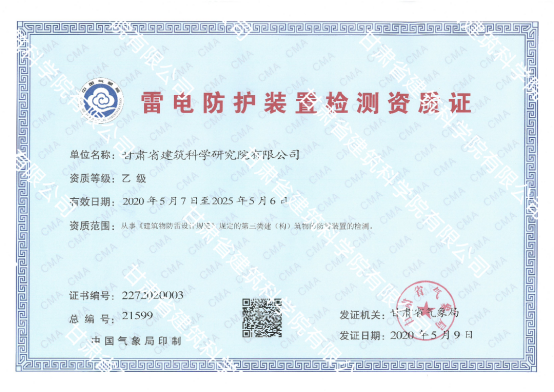 近日,經(jīng)甘肅省氣象局審查,甘肅省建筑科學研究院有限公司喜獲甘肅省氣象局頒發(fā)的《雷電防護裝置檢測資質(zhì)證書(乙級)》。