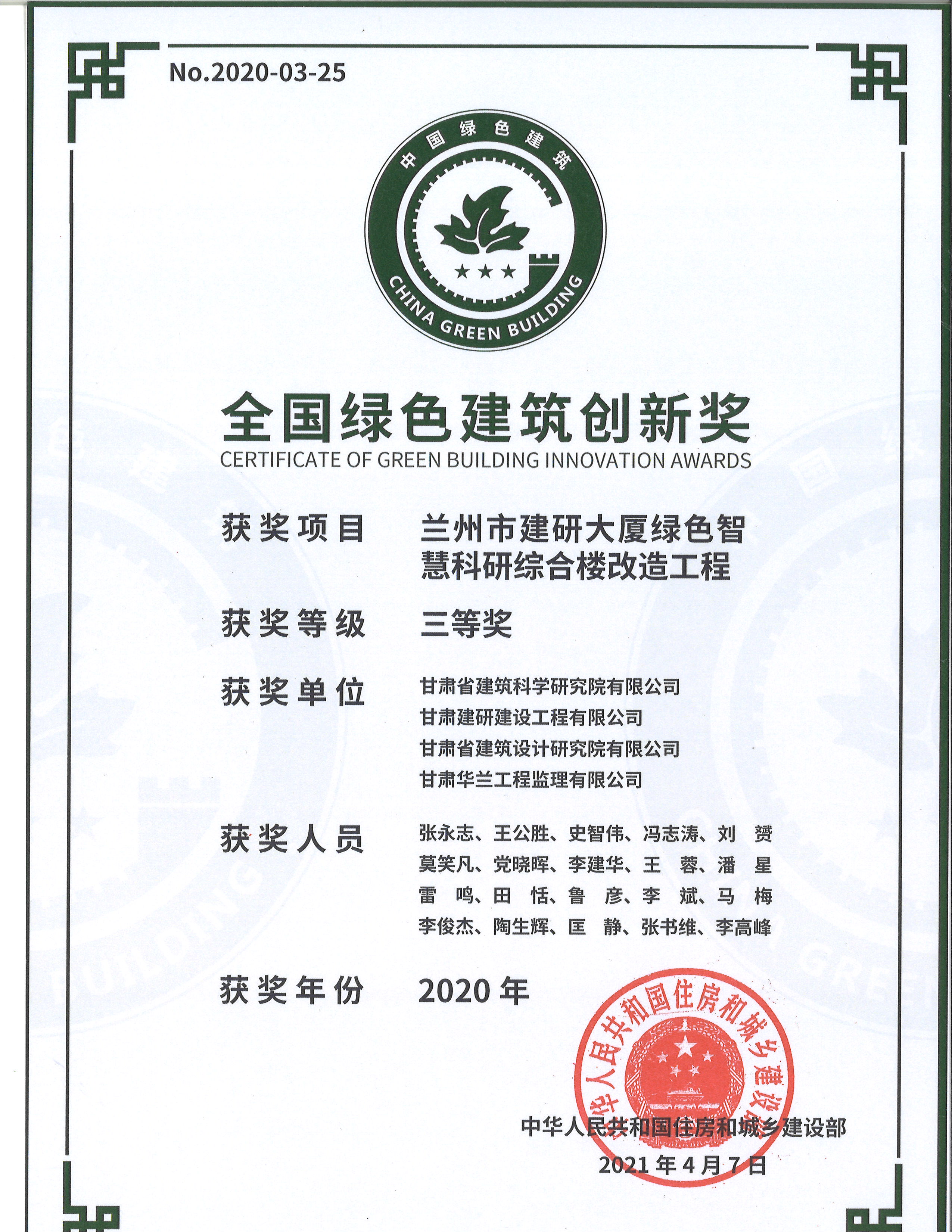 4月8日,住房和城鄉(xiāng)建設(shè)部召開新聞發(fā)布會,公布了2020年度全國綠色建筑創(chuàng)新獎獲獎名單,由甘肅省建筑科學研究院有限公司主要完成的“蘭州市建研大廈綠色智慧科研綜合類改造工程”榮獲全國綠色建筑創(chuàng)新獎三等獎。這是建科院公司繼榮獲第七屆甘肅省政府質(zhì)量獎提名獎后獲得的又一殊榮。