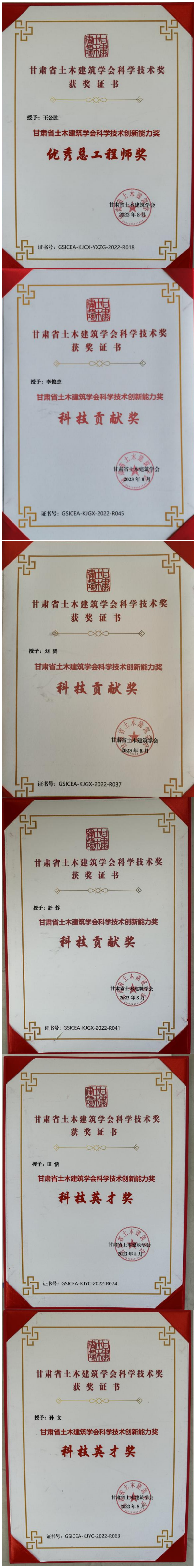 10月20日,在甘肅省土木建筑學會組織舉行的“甘肅省建設行業(yè)科技創(chuàng)新成果研討會暨頒獎典禮”上,甘肅建科院獲2022年度甘肅省土木建筑學會“科學技術獎”一等獎2項,二等獎1項;獲甘肅省土木建筑學會科學技術創(chuàng)新能力獎“科技創(chuàng)新獎”1項。王公勝獲甘肅省土木建筑學會科學技術創(chuàng)新能力獎“優(yōu)秀總工程師獎”;劉赟、李俊杰、舒蓉3人獲甘肅省土木建筑學會科學技術創(chuàng)新能力獎“科技貢獻獎”;孫文、田恬2人獲甘肅省土木建筑學會科學技術創(chuàng)新能力獎“科技英才獎”。
