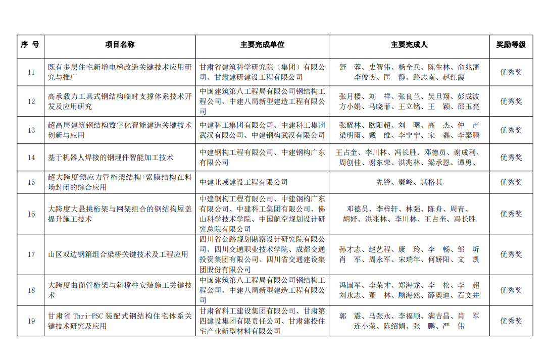 5月5日,由甘肅省建筑科學(xué)研究院(集團)有限公司巖土技術(shù)中心申報的“既有多層住宅新增電梯改造關(guān)鍵技術(shù)應(yīng)用研究與推廣”科研課題榮獲2022年度中國建筑金屬結(jié)構(gòu)協(xié)會科學(xué)技術(shù)獎優(yōu)秀獎,表明了國內(nèi)建筑鋼結(jié)構(gòu)行業(yè)對公司創(chuàng)新能力與技術(shù)水平的肯定與認(rèn)可。