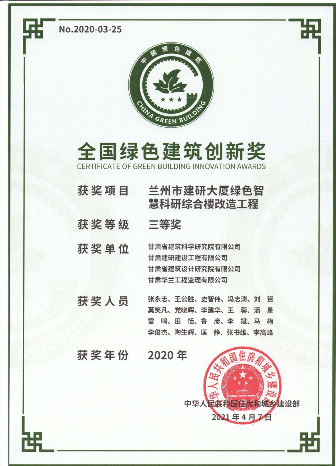 4月8日,住房和城鄉(xiāng)建設(shè)部召開新聞發(fā)布會,公布了2020年度全國綠色建筑創(chuàng)新獎獲獎名單,由建科院(集團)公司主要完成的“蘭州市建研大廈綠色智慧科研綜合類改造工程”榮獲全國綠色建筑創(chuàng)新獎三等獎。這是建科院公司繼2021年3月榮獲第七屆甘肅省政府質(zhì)量獎提名獎后獲得的又一殊榮。