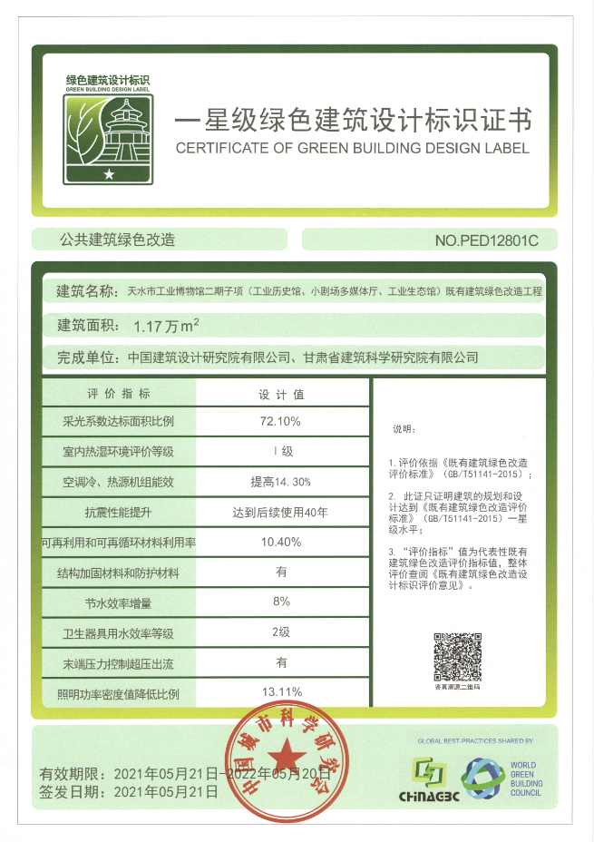 10月,中國城市科學研究會通過線上的方式召開全國第七批綠色建筑標識評審會,由建科院(集團)公司綠建中心進行既有建筑綠色改造設(shè)計(一星)評價咨詢的天水市工業(yè)博物館二期子項順利通過了綠建評審。2020年8月,中國建筑設(shè)計研究院有限公司委托建科院(集團)公司對該項目進行既有建筑綠色改造設(shè)計(一星)評價咨詢。建科院(集團)公司綠色建筑與產(chǎn)業(yè)研發(fā)中心為該項目的綠建改造和綠色建筑標識申報提供了技術(shù)支撐。本項目是建科院(集團)公司綠建中心繼《蘭州市建研大廈綠色智慧改造項目》之后的又一個甘肅省既有建筑綠色改造項目評星工作,此項工作的順利完成在響應(yīng)國家政策號召的同時也體現(xiàn)了建科院(集團)公司在既有建筑物綠色改造方面的雄厚實力。