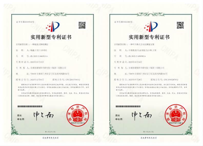 近日,地基巖土專業(yè)事業(yè)部申報(bào)的“一種地基沉降檢測(cè)儀”和“一種可升降式全站儀測(cè)量支架”兩項(xiàng)實(shí)用新型專利正式獲得國(guó)家知識(shí)產(chǎn)權(quán)局審核并授予專利通知。