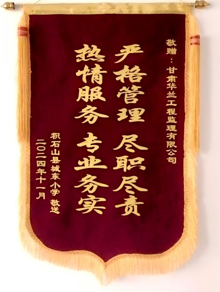 近日,甘肅建科院華蘭監(jiān)理公司積石山縣城東小學(xué)維修加固項(xiàng)目部收到了來自學(xué)校領(lǐng)導(dǎo)贈(zèng)送的一面繡著“嚴(yán)格監(jiān)理 盡職盡責(zé) 熱情服務(wù) 專業(yè)務(wù)實(shí)”的錦旗,錦旗上的十六個(gè)字不僅凝聚了校方的感激與贊許,更是對(duì)監(jiān)理公司以實(shí)際行動(dòng)踐行國企擔(dān)當(dāng)?shù)恼鎸?shí)寫照。