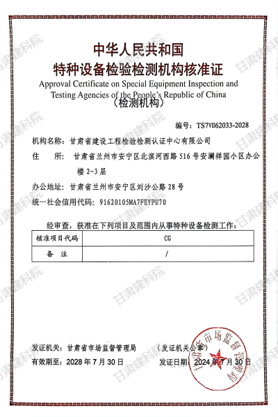 近日,甘肅建科院檢驗(yàn)檢測(cè)認(rèn)證中心公司順利通過評(píng)審,取得了“特種設(shè)備檢驗(yàn)檢測(cè)機(jī)構(gòu)核準(zhǔn)證”,標(biāo)志著公司在鋼結(jié)構(gòu)工程質(zhì)量檢測(cè)領(lǐng)域邁出了堅(jiān)實(shí)的一步,實(shí)現(xiàn)了技術(shù)實(shí)力與服務(wù)水平的雙重飛躍。
