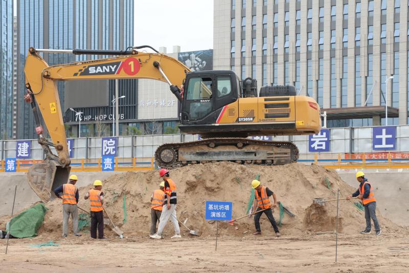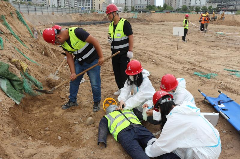 上午10時(shí)整,隨著王春景一聲令下,各作業(yè)區(qū)、部室及演練人員迅速到達(dá)指定區(qū)域開始模擬基坑塌陷演練。其設(shè)置情景是:勞務(wù)作業(yè)人員在現(xiàn)場作業(yè)期間發(fā)生土方塌方,該班組安全員發(fā)現(xiàn)了該作業(yè)人員被掩埋,立即上前進(jìn)行施救,并快速將人員信息傳送至項(xiàng)目部應(yīng)急領(lǐng)導(dǎo)小組,報(bào)告塌方事故的時(shí)間、地點(diǎn)等信息。現(xiàn)場指揮根據(jù)事故情況宣布啟動(dòng)應(yīng)急預(yù)案,立即通知項(xiàng)目部醫(yī)療小組、安全小組帶上擔(dān)架、藥箱、警戒線立刻趕往現(xiàn)場準(zhǔn)備警戒施救工作,通知救護(hù)車輛進(jìn)場待命。