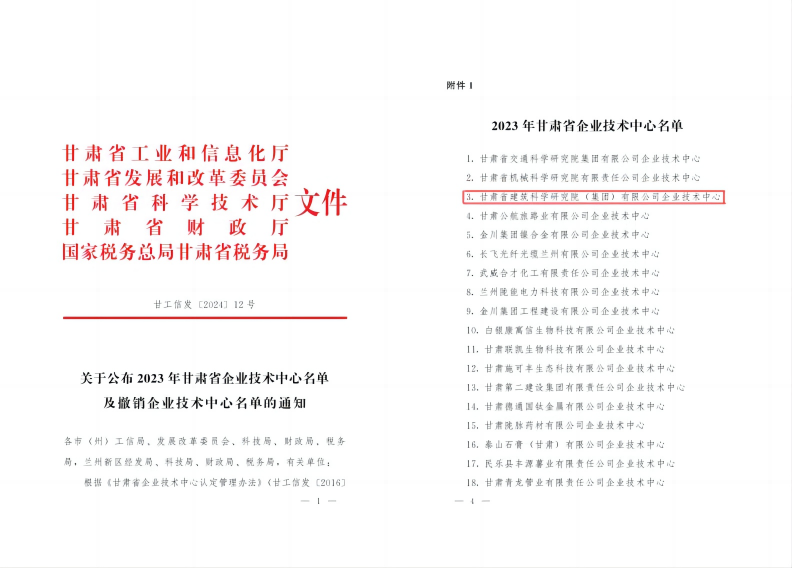 近日,從甘肅省工信廳獲悉,甘肅建科院成功獲批甘肅省企業(yè)技術(shù)中心。此次甘肅建科院獲批省級(jí)企業(yè)技術(shù)中心,是政府行業(yè)主管部門(mén)對(duì)公司創(chuàng)新能力及創(chuàng)新成果的肯定,代表著公司科技創(chuàng)新水平與科技創(chuàng)新實(shí)力處于省內(nèi)行業(yè)領(lǐng)先地位,標(biāo)志著公司品牌形象及綜合實(shí)力再上新臺(tái)階。