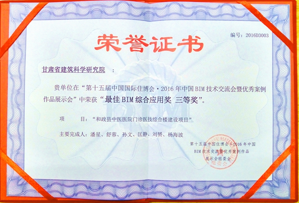 甘肅省建筑科學(xué)研究院參加了本次第十五屆中國(guó)住博會(huì)·2016年中國(guó)BIM技術(shù)交流會(huì)大賽。本次大賽主要分為兩個(gè)階段:第一階段,項(xiàng)目模型網(wǎng)絡(luò)投票,本階段占最終分值的30%;第二階段,項(xiàng)目模型實(shí)際檢測(cè),評(píng)委組專家通過對(duì)實(shí)際模型檢測(cè)及評(píng)估得出相應(yīng)的分值,本階段占最終分值的70%。甘肅省建筑科學(xué)研究院科技研發(fā)中心BIM小組申報(bào)的《和政縣中醫(yī)醫(yī)院門診醫(yī)技綜合樓建設(shè)項(xiàng)目》獲得了此次大賽綜合應(yīng)用組的最佳BIM綜合應(yīng)用三等獎(jiǎng),這是第十五屆中國(guó)住博會(huì)·2016年中國(guó)BIM技術(shù)交流會(huì)甘肅省獲得的唯一一個(gè)獎(jiǎng)項(xiàng),對(duì)甘肅省建筑科學(xué)研究院在BIM領(lǐng)域的發(fā)展意義重大、機(jī)會(huì)彌足珍貴。