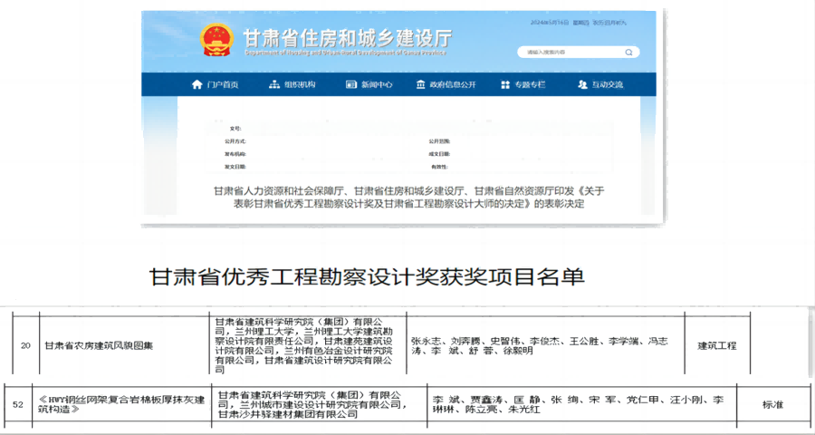 近日,甘肅省人力資源和社會保障廳、甘肅省住房和城鄉(xiāng)建設(shè)廳、甘肅省自然資源廳公布了2023年度甘肅省優(yōu)秀工程勘察設(shè)計獎提名獲獎項目名單,甘肅建科院2個項目獲獎。