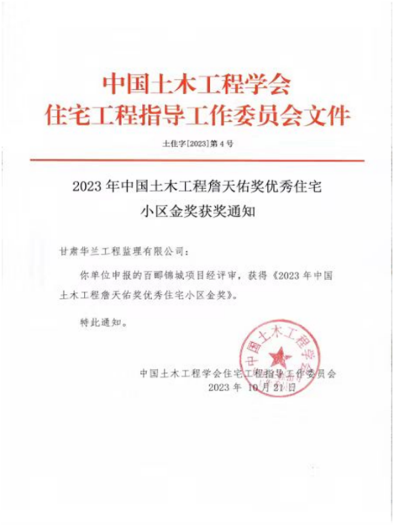 近日,從中國土木工程學(xué)會住宅工程指導(dǎo)委員會傳來喜訊,由甘肅華蘭工程監(jiān)理有限公司參與建設(shè)的成都百酈錦城項(xiàng)目榮獲“2023中國土木工程詹天佑獎(jiǎng)優(yōu)秀住宅小區(qū)金獎(jiǎng)”。