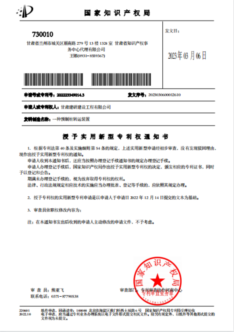 2023年一季度,經(jīng)國(guó)家知識(shí)產(chǎn)權(quán)局審核批準(zhǔn),建研建設(shè)公司申報(bào)的“一種梁粘鋼加固加壓裝置”“一種既有混凝土結(jié)構(gòu)增層節(jié)點(diǎn)”和“一種預(yù)制樁轉(zhuǎn)運(yùn)裝置”三項(xiàng)實(shí)用新型專利獲得授權(quán)。截止目前,建研建設(shè)公司已授權(quán)發(fā)明專利2項(xiàng)、實(shí)用新型專利20余項(xiàng),在審發(fā)明專利2項(xiàng)。